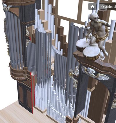 The realistic appearance of the model was created using a combination of photogrammetry and 3D scanning technology (decorative cabinet and statues) and visualization from technical documentation (internal layout). The model has an interactive drop-down description of the individual registers. There is a choice of two languages.